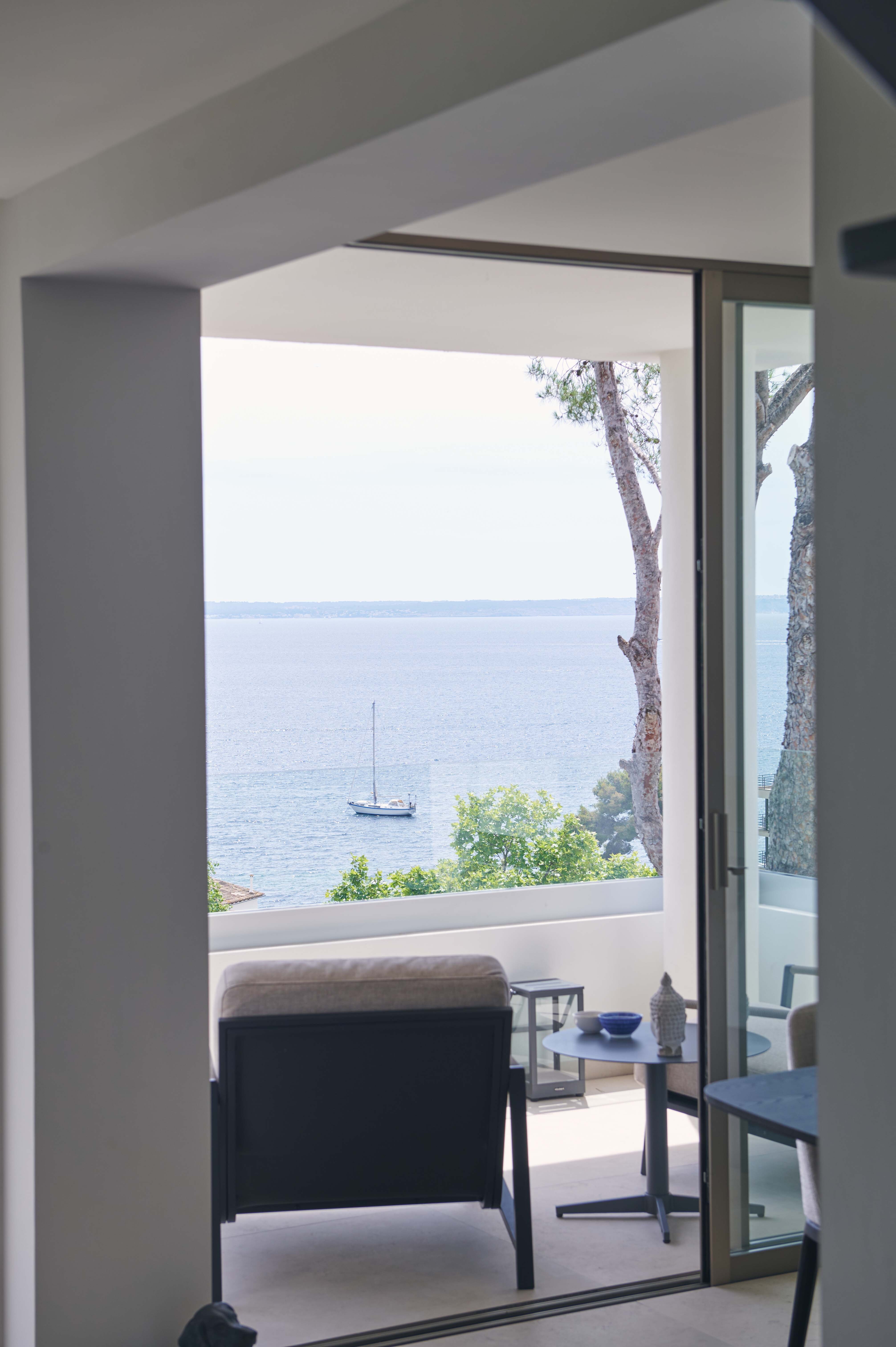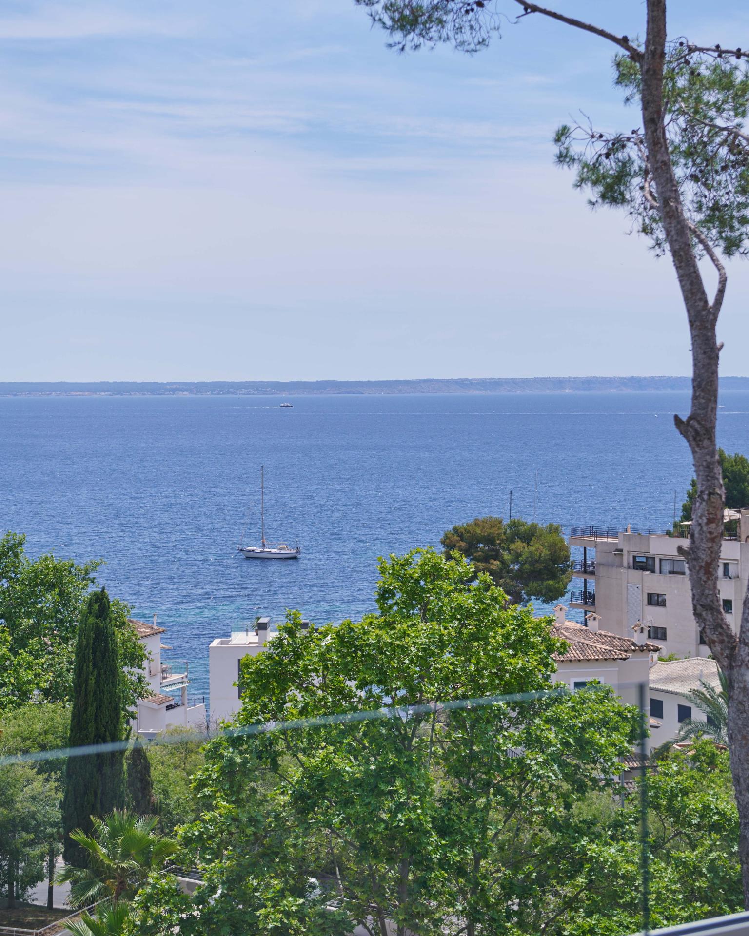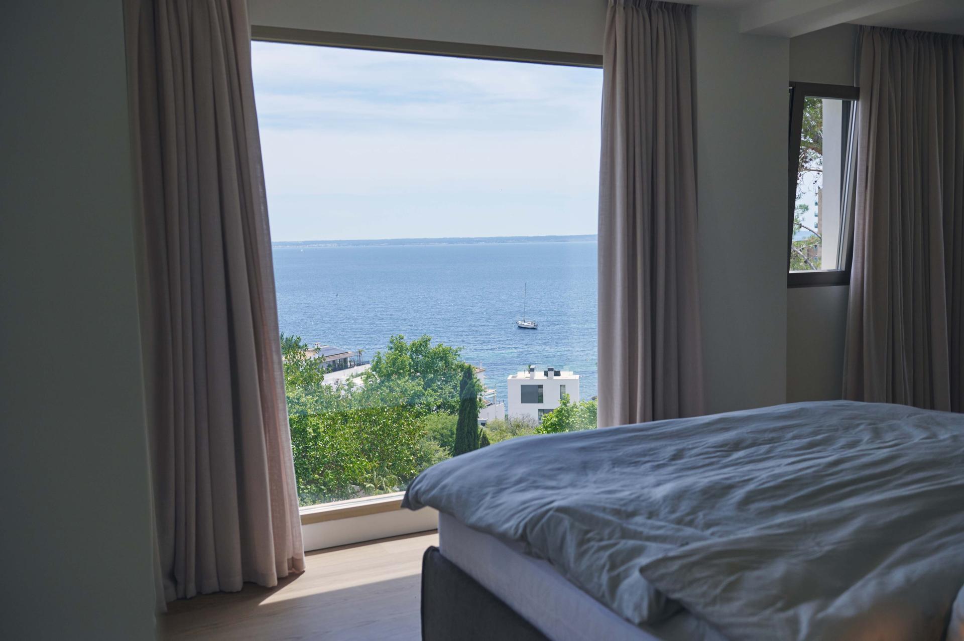 The entrance leads through a former stairwell into an open-plan kitchen, dining and living area. Large sliding doors open to a balcony with lounge chairs and a small dining space – and an unforgettable view of the bay.